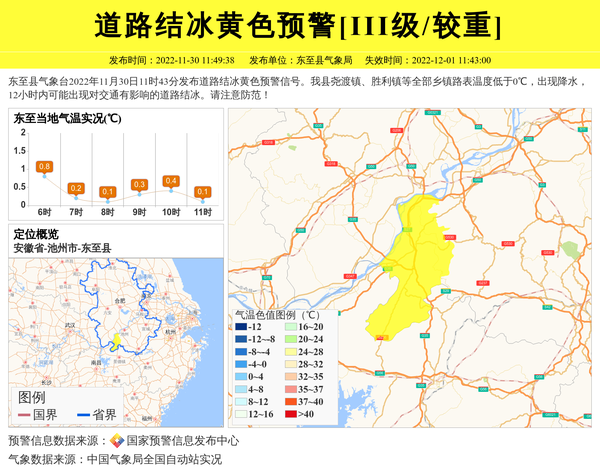 东至县气象台2022年11月30日11时43分发布道路结冰黄色预警信号。我县尧渡镇、胜利镇等全部乡镇路表温度低于0℃,出现降水,12小时内可能出现对交通有影响的道路结冰。请注意防范! 信息来源:国家预警信息发布中心; 发布单位:东至县气象局。