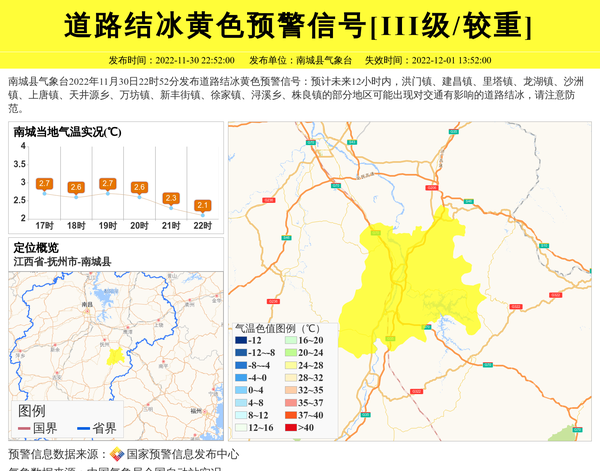 南城县气象台2022年11月30日22时52分发布道路结冰黄色预警信号:预计未来12小时内,洪门镇、建昌镇、里塔镇、龙湖镇、沙洲镇、上唐镇、天井源乡、万坊镇、新丰街镇、徐家镇、浔溪乡、株良镇的部分地区可能出现对交通有影响的道路结冰,请注意防范。 信息来源:国家预警信息发布中心; 发布单位:南城县气象台。