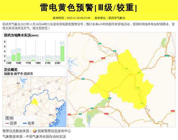 邵武市气象台2022年11月30日00时23分发布雷电黄色预警信号:预计未来6小时内我市有雷电活动,雷雨时局地伴有短时强降水、雷雨大风等强对流天气。请注意防范! 信息来源:国家预警信息发布中心; 发布单位:邵武市气象台。