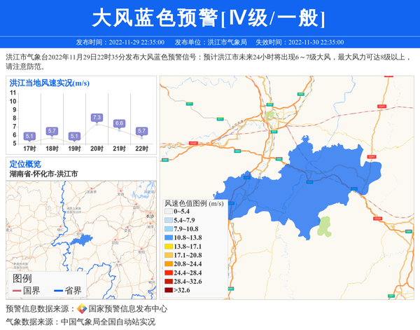 洪江市气象台2022年11月29日22时35分发布大风蓝色预警信号:预计洪江市未来24小时将出现6~7级大风,最大风力可达8级以上,请注意防范。 信息来源:国家预警信息发布中心; 发布单位:洪江市气象局。