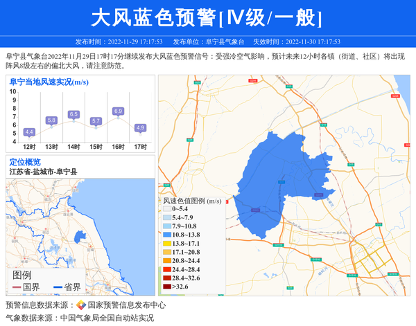 阜宁县气象台2022年11月29日17时17分继续发布大风蓝色预警信号:受强冷空气影响,预计未来12小时各镇(街道、社区)将出现阵风8级左右的偏北大风,请注意防范。 信息来源:国家预警信息发布中心; 发布单位:阜宁县气象台。