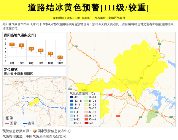 郧阳区气象台2022年11月30日12时04分发布道路结冰黄色预警信号:预计今天白天到夜间,郧阳区将出现对交通有影响的道路结冰,请注意防范。 信息来源:国家预警信息发布中心; 发布单位:郧阳区气象台。