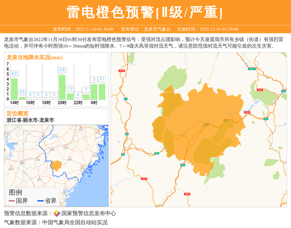 龙泉市气象台2022年11月30日01时30分发布雷电橙色预警信号:受强对流云团影响,预计今天凌晨我市所有乡镇(街道)有强烈雷电活动,并可伴有小时雨强10~30mm的短时强降水、7~9级大风等强对流天气,请注意防范强对流天气可能引发的次生灾害。 信息来源:国家预警信息发布中心; 发布单位:龙泉市气象台。