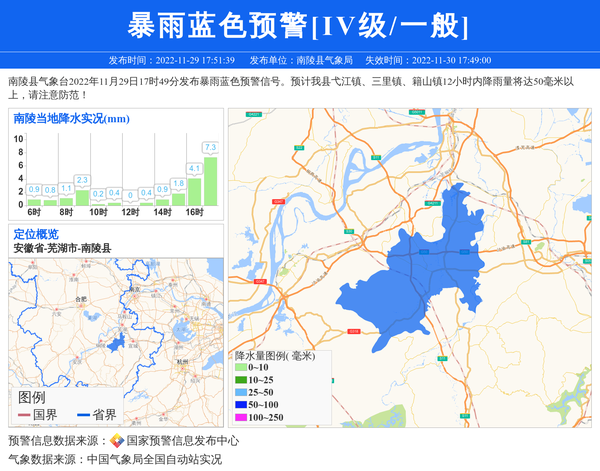 南陵县气象台2022年11月29日17时49分发布暴雨蓝色预警信号。预计我县弋江镇、三里镇、籍山镇12小时内降雨量将达50毫米以上,请注意防范! 信息来源:国家预警信息发布中心; 发布单位:南陵县气象局。