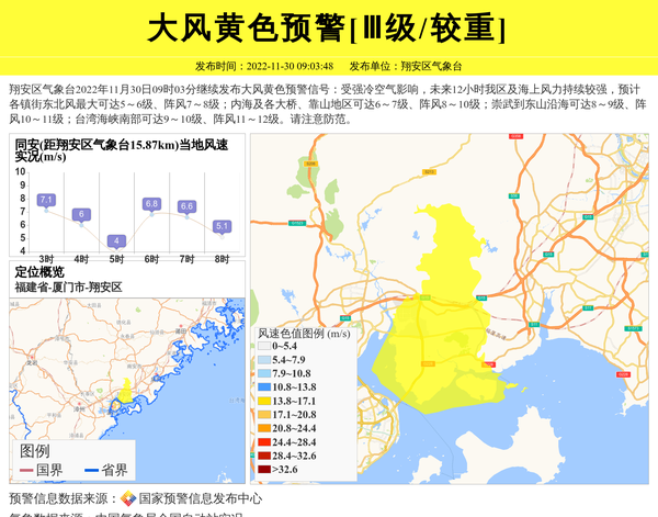 翔安区气象台2022年11月30日09时03分继续发布大风黄色预警信号:受强冷空气影响,未来12小时我区及海上风力持续较强,预计各镇街东北风最大可达5~6级、阵风7~8级;内海及各大桥、靠山地区可达6~7级、阵风8~10级;崇武到东山沿海可达8~9级、阵风10~11级;台湾海峡南部可达9~10级、阵风11~12级。请注意防范。 信息来源:国家预警信息发布中心; 发布单位:翔安区气象台。