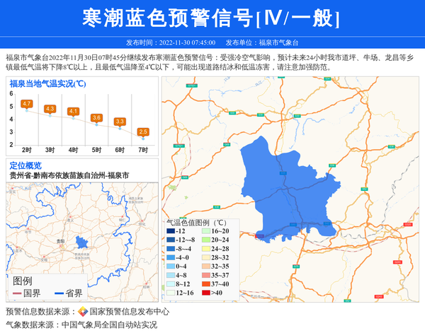 福泉市气象台2022年11月30日07时45分继续发布寒潮蓝色预警信号:受强冷空气影响,预计未来24小时我市道坪、牛场、龙昌等乡镇最低气温将下降8℃以上,且最低气温降至4℃以下,可能出现道路结冰和低温冻害,请注意加强防范。 信息来源:国家预警信息发布中心; 发布单位:福泉市气象台。