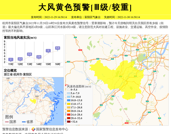 杭州市富阳区气象台2022年11月29日16时50分发布大风黄色预警信号:受寒潮影响,预计今天傍晚到明天白天我区所有乡镇(街道)最大偏北风平原地区6到8级,山区和江河水面8到10级,请注意防范大风对在建工程、设施农业、交通运输、高空作业、疫情防控等的不利影响。 信息来源:国家预警信息发布中心; 发布单位:富阳区气象台。