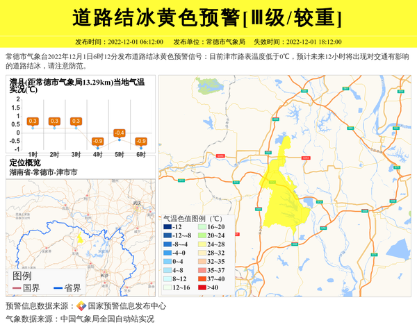 常德市气象台2022年12月1日6时12分发布道路结冰黄色预警信号:目前津市路表温度低于0℃,预计未来12小时将出现对交通有影响的道路结冰,请注意防范。 信息来源:国家预警信息发布中心; 发布单位:常德市气象局。