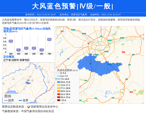 大风蓝色预警信号:预计2日白天,苏家屯区西南风4到6级,阵风7级,请注意出行安全,加固临时搭建物,防范高空坠物等风险。苏家屯区气象台2022年12月2日7时21分发布 信息来源:国家预警信息发布中心; 发布单位:苏家屯区气象局。