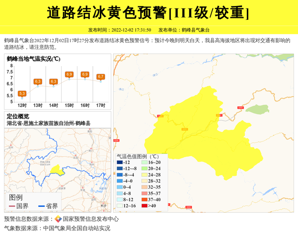 鹤峰县气象台2022年12月02日17时27分发布道路结冰黄色预警信号:预计今晚到明天白天,我县高海拔地区将出现对交通有影响的道路结冰,请注意防范。 信息来源:国家预警信息发布中心; 发布单位:鹤峰县气象台。