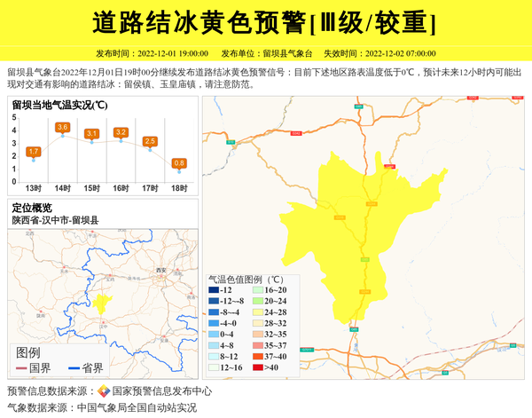 留坝县气象台2022年12月01日19时00分继续发布道路结冰黄色预警信号:目前下述地区路表温度低于0℃,预计未来12小时内可能出现对交通有影响的道路结冰:留侯镇、玉皇庙镇,请注意防范。 信息来源:国家预警信息发布中心; 发布单位:留坝县气象台。
