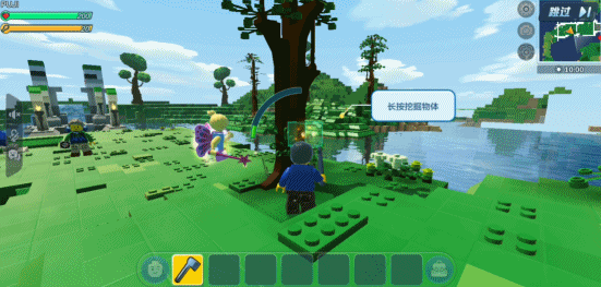 回到游戏本身,乐高作为锻炼创造力的玩具,和沙盒玩法结合可以说是再合适不过的选择。本作也针对全年龄段的玩家设置了相当贴心的入门指导。和其他沙盒游戏一样,游戏必须从零开始。路人送你一把斧头,你就从砍到大树,再到制造工作台,从此走上无限创造的道路。
